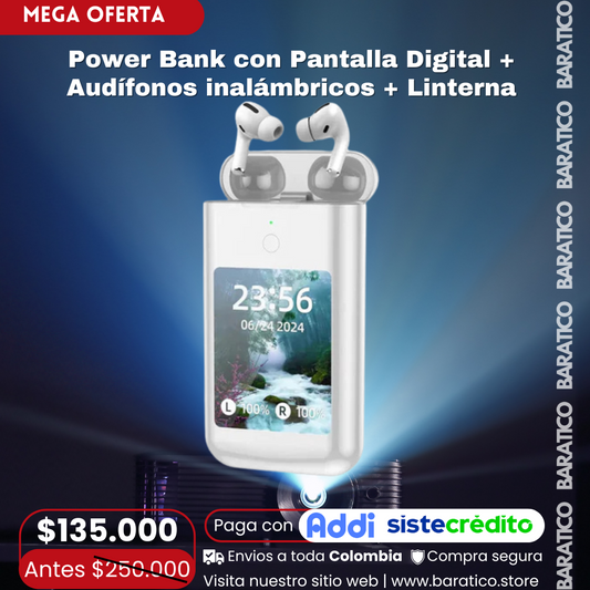 PowerBank con Pantalla Digital + Audífonos inalámbricos + Linterna