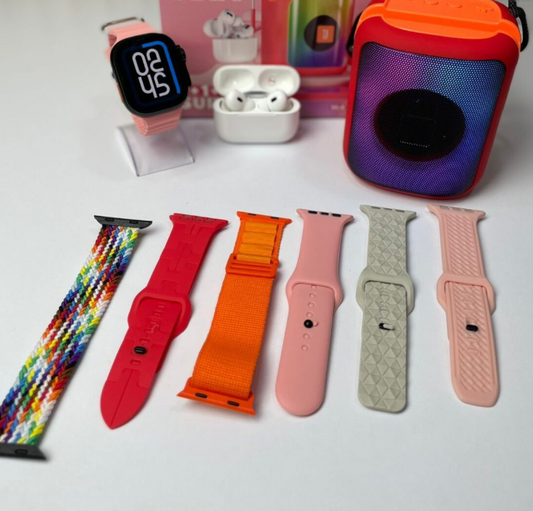 COMBO K28 – SMARTWATCH + AUDÍFONOS INALÁMBRICOS + PARLANTE RGB + CORREAS INTERCAMBIABLES