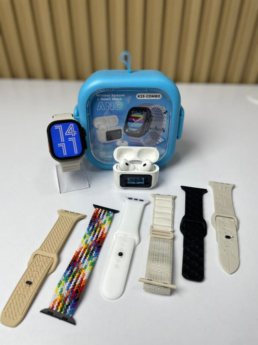 COMBO k25 SMARTWATCH + AUDÍFONOS INALÁMBRICOS PANTALLA + 6 MANILLAS