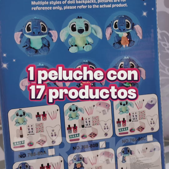 Incluye un bolso tipo mochila de peluche súper suave con la forma de Stitch, ideal para llevar a todas partes, junto con un completo set de accesorios de belleza para jugar al salón o al maquillaje.