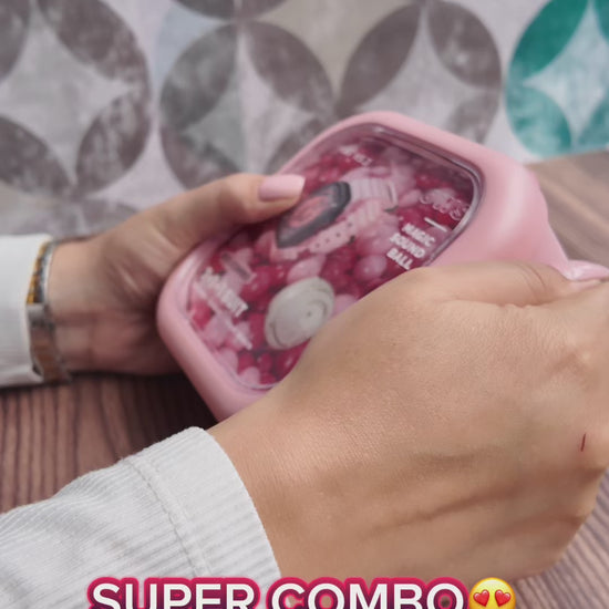El K21-COMBO es un set tecnológico que combina un reloj inteligente multifuncional con unos audífonos inalámbricos tipo OWS (Open Wireless Stereo), presentados en un estuche rígido con diseño llamativo lleno de esferas decorativas tipo “Magic Sound Ball”