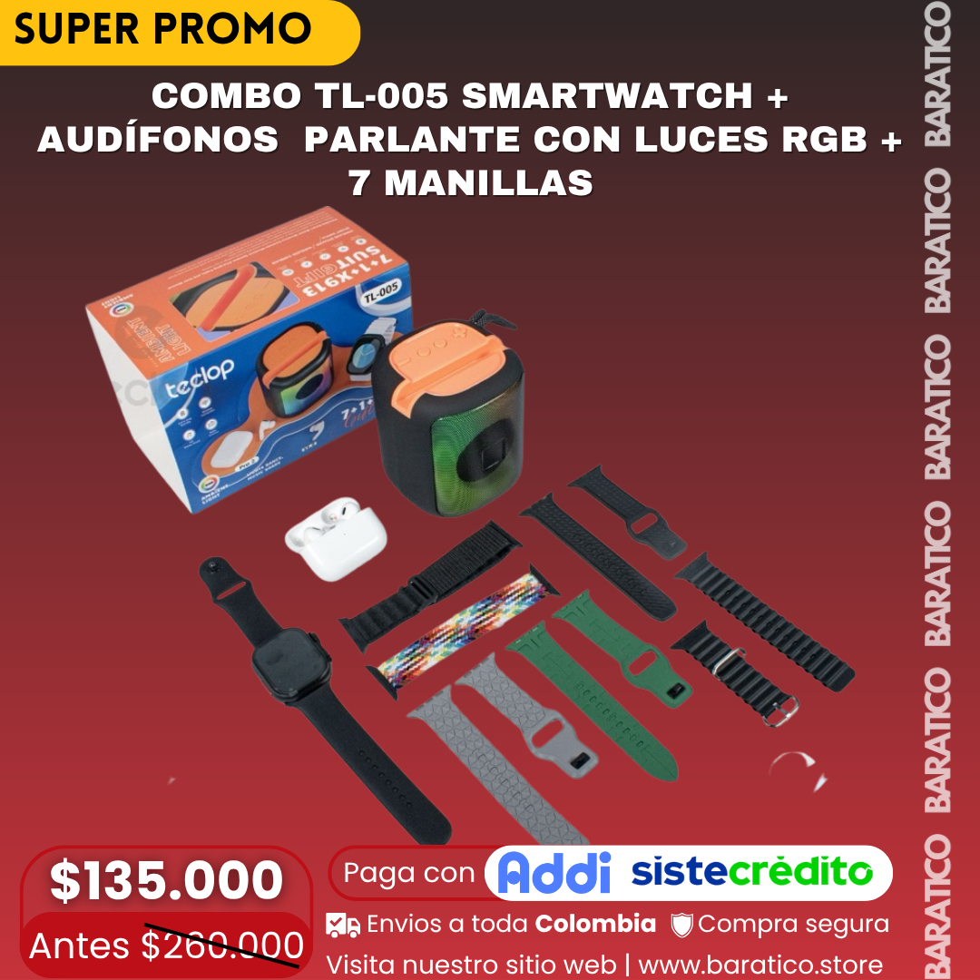 COMBO TL-005 SMARTWATCH + AUDÍFONOS + PARLANTE CON LUCES RGB + 7 MANILLAS